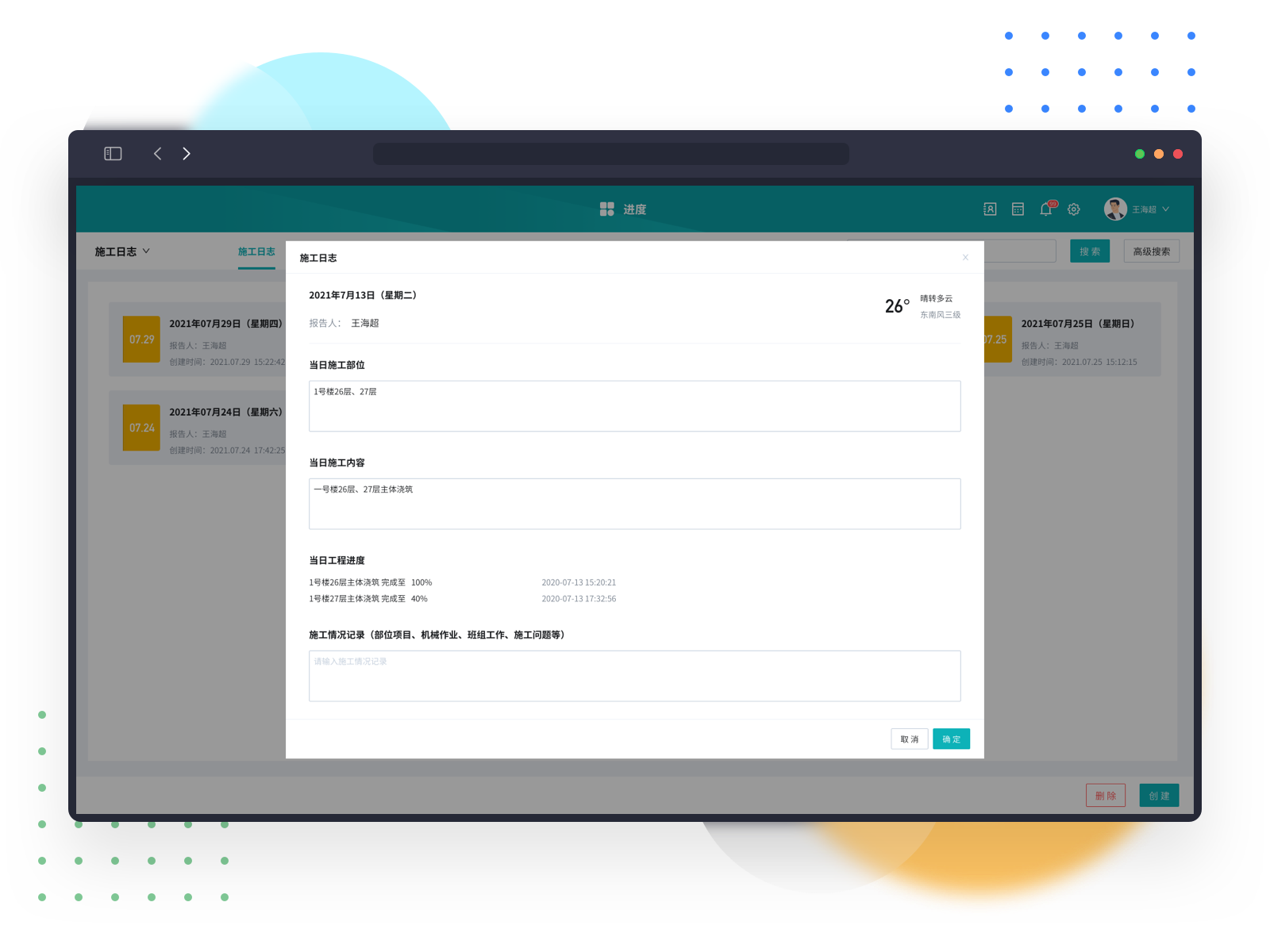 自动采集当日进度,结合用户填报内容,生成施工日志